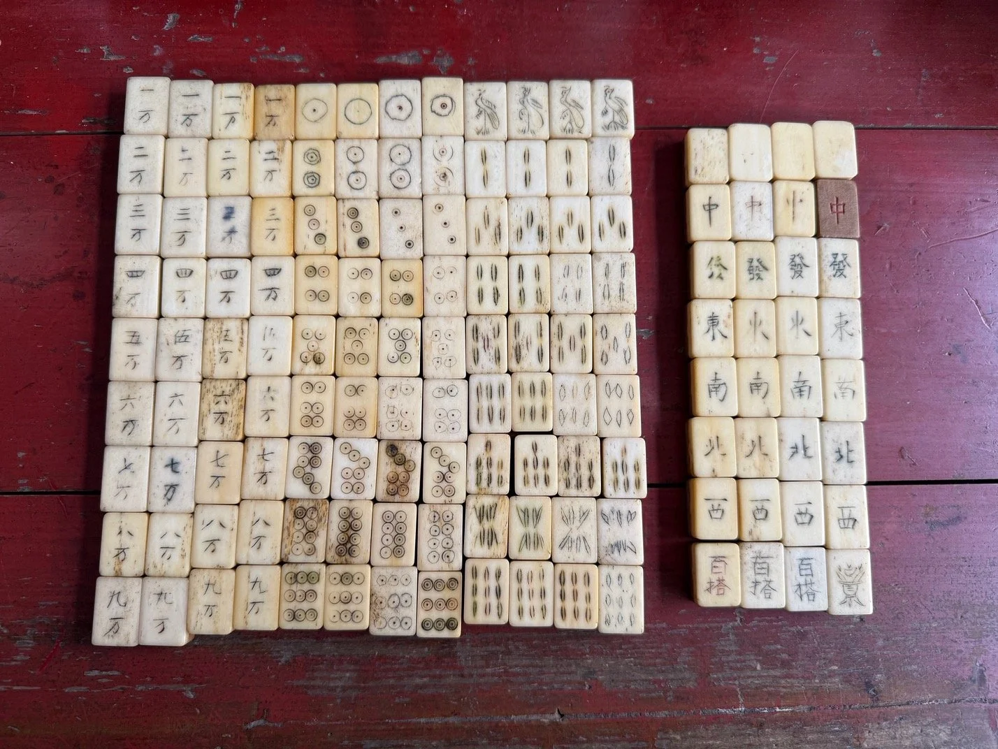 Over the years I have seen many Frankenstein sets, where tiles have been taken from other sets to replace lost pieces. As we all know bamboo and bone tiles were made in huge variation, not only different carving styles on the face, but also the size, colour, patina, shape, thickness of bone and bamboo grain all varied. I recently came across this set and thought it a good example of how difficult it can be to merge tiles successfully, and decided to share.