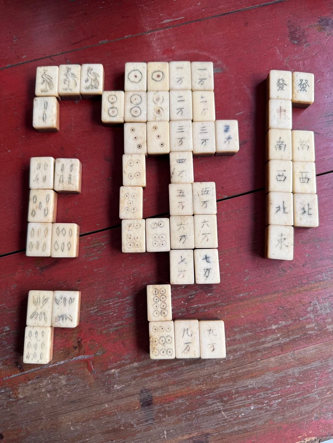 The main part of the ‘set’ are old tiles, hand carved in a naive style, on thick yellowish, waxy bone. Some pieces have more Haversian lines than others, and some show wear and discolouration on their face. The colour and texture of the bone suggests its Chinese rather than imported bone, unbleached when turned into tiles. There are many tiles missing!